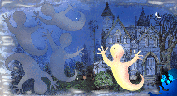 After working out Bill's birthday Baby fell fast asleep. Baby dreamt of boiled eggs with runny yolks. When Baby awoke the scene had changed and Baby was outside a very spooky looking house and facing a very spooky Spook! "Oooooh!" cried the little ghost.